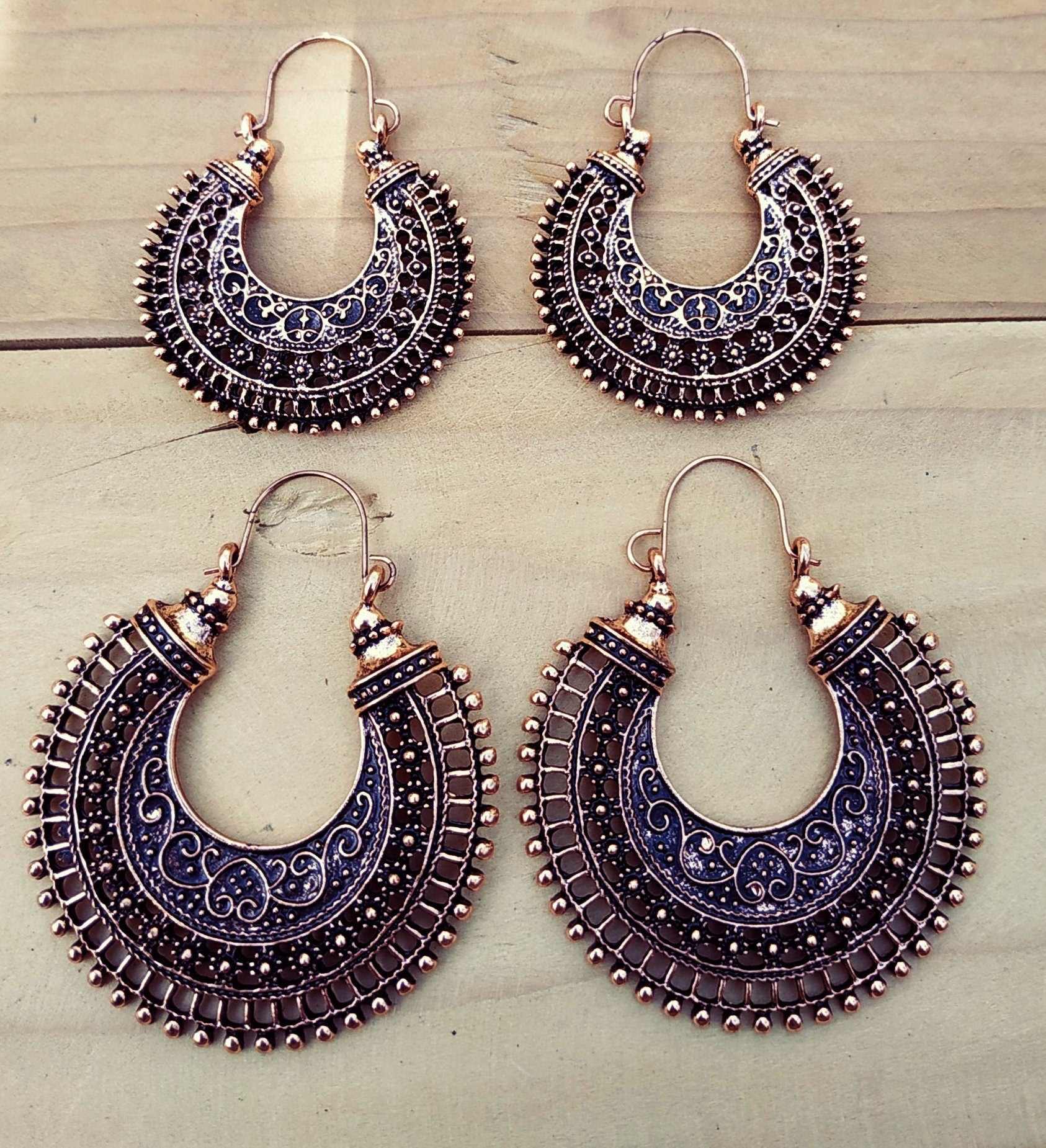 Crescent Earring,Silver Hoop ornate Earring- Rose gold Filigree Earring- Gypsy Jewelry - Hoop Earrings Tribal Jewelry-