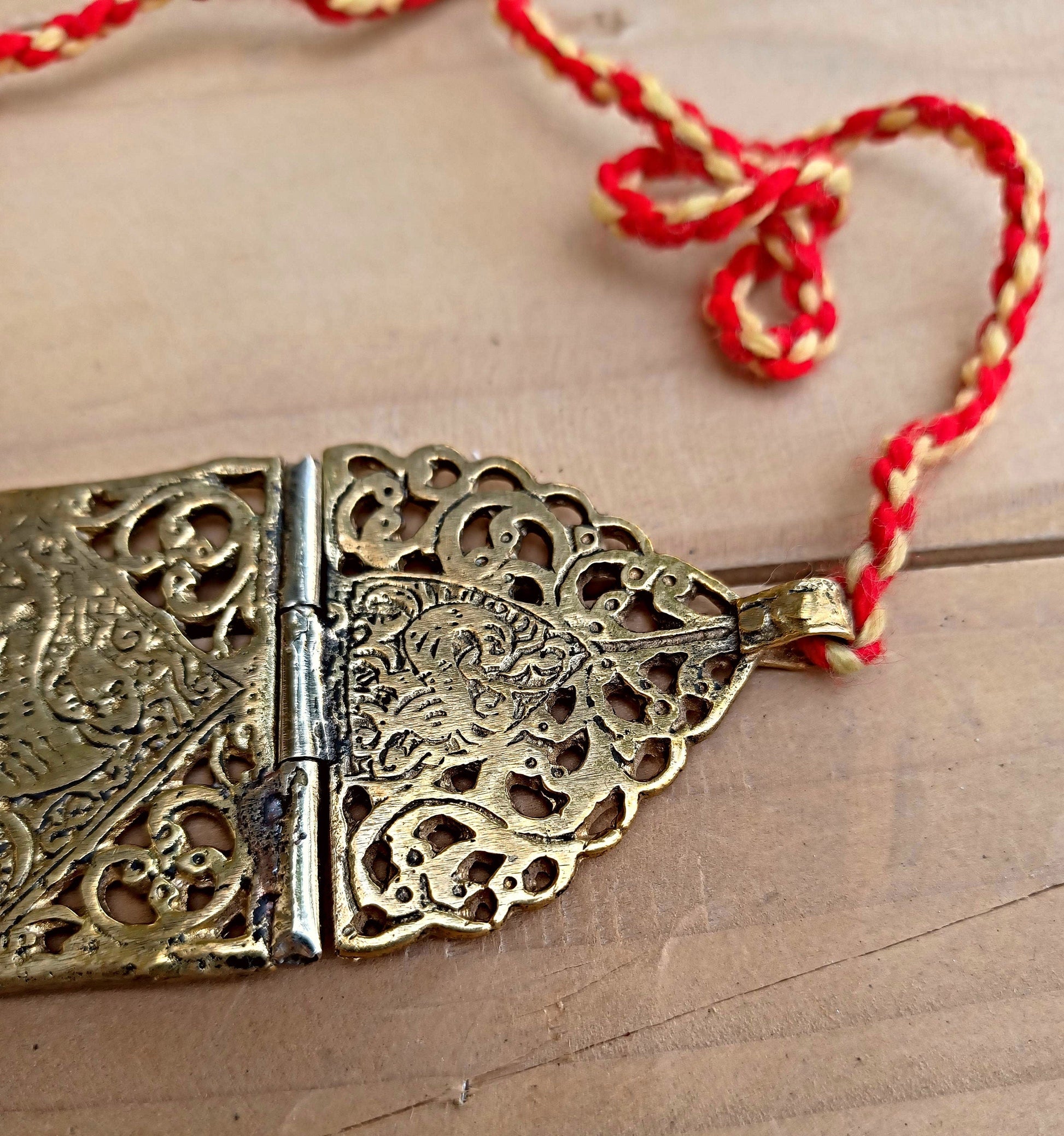 The necklace is entirely hand made, metal pieces taken and hammered and then joined together with ropes of hand weaved thread.Two glass stones attached at each end for extra glam.The necklace can also be worn on the arm as a bazu band.